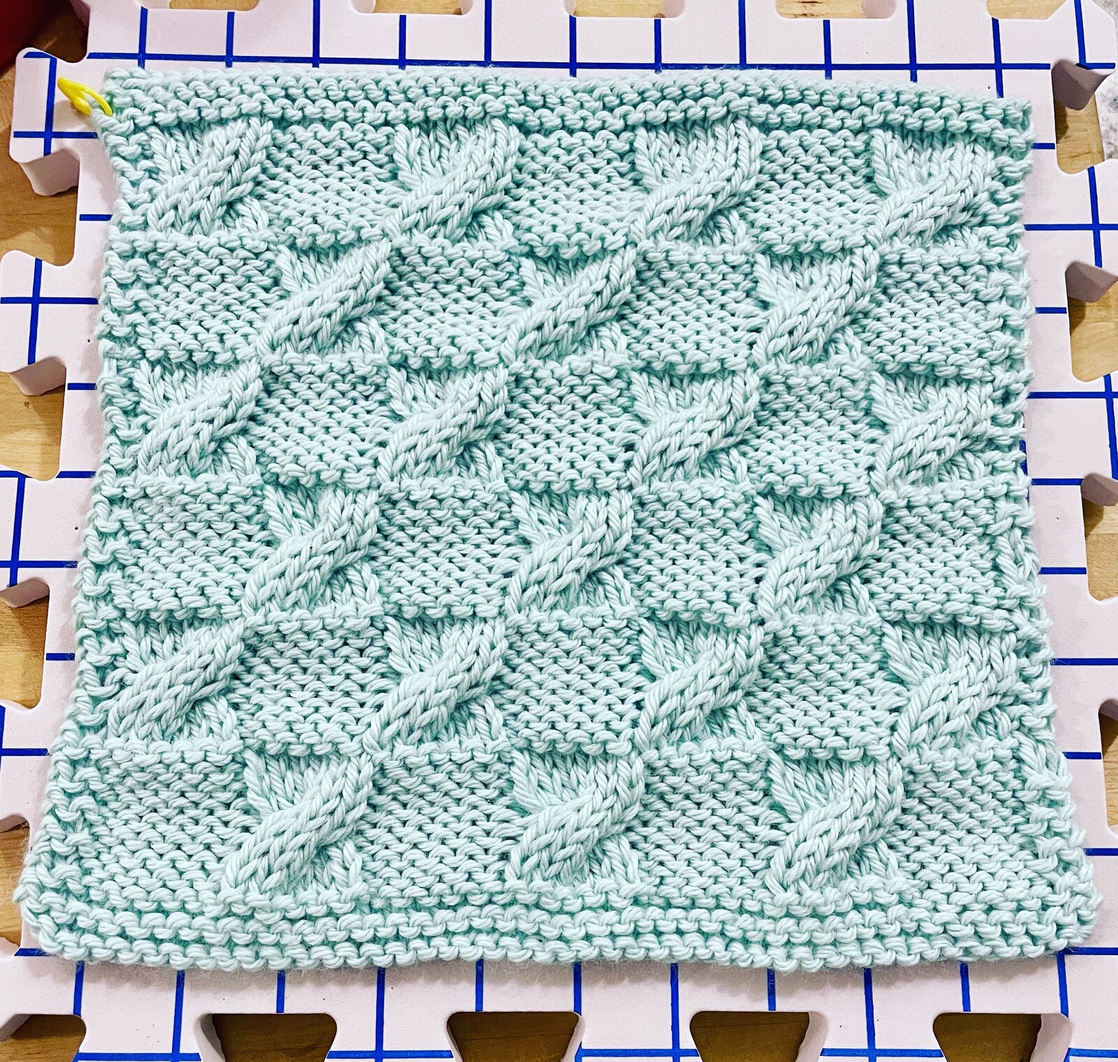 The finished result is delightful! It has texture and interest with wavy cables running over a sea of purl checks. My first thought was how fun this would be as a filler stitch on a sweater.