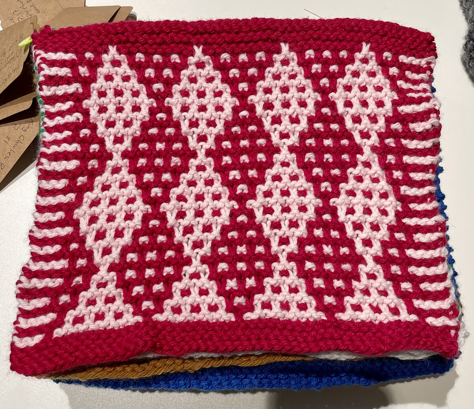 My new favorite pattern from Barbara Walker’s, A Treasury of Knitting Patterns Vol 1, pages 88-89 is the Harlequin Pattern. It doesn’t look like much from the accompanying picture in the book, but a) this is a fun knit, b) the resulting texture is robust, and c) the pattern is delightful! I am also delighted with my choice of colors using Berroco Vintage Chunky, colorway 6110 Fondant, and a lovely contrasting colorway 6151 Cardinal. Of course, it’s only my favorite till the next one. They are all fun. They all have tricks to learn and new skills to try.