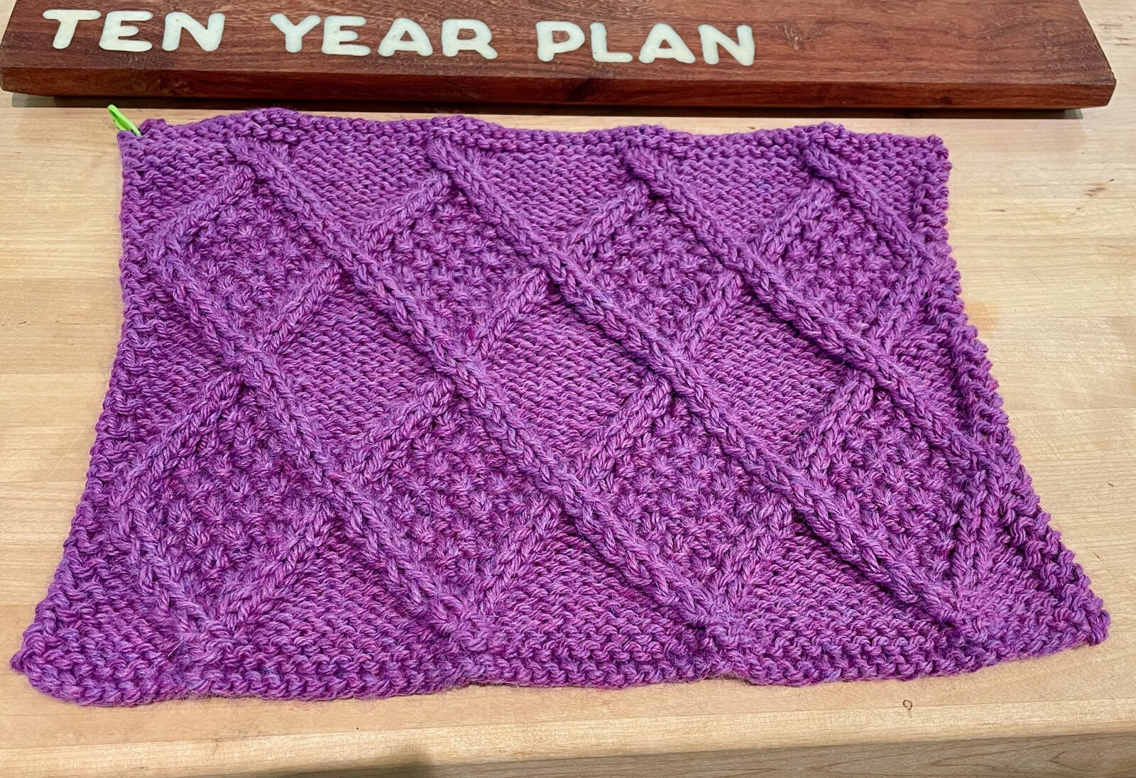 The next Crazy Quilt swatch block is the beautiful Trellis with Moss Stitch pattern in Barbara Walker’s A Treasury of Knitting Patterns Vol 1, page 261.